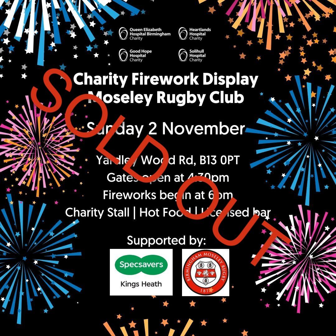 Your local hospital charity has partnered up with Moseley Rugby Club to bring you a spectacular firework display this Bonfire night. Come and join in the fun with family and friends! The event includes charity stalls and tombola, hot food, and a licensed bar also available. Thank you to Specsavers in Kings Heath for supporting the event.