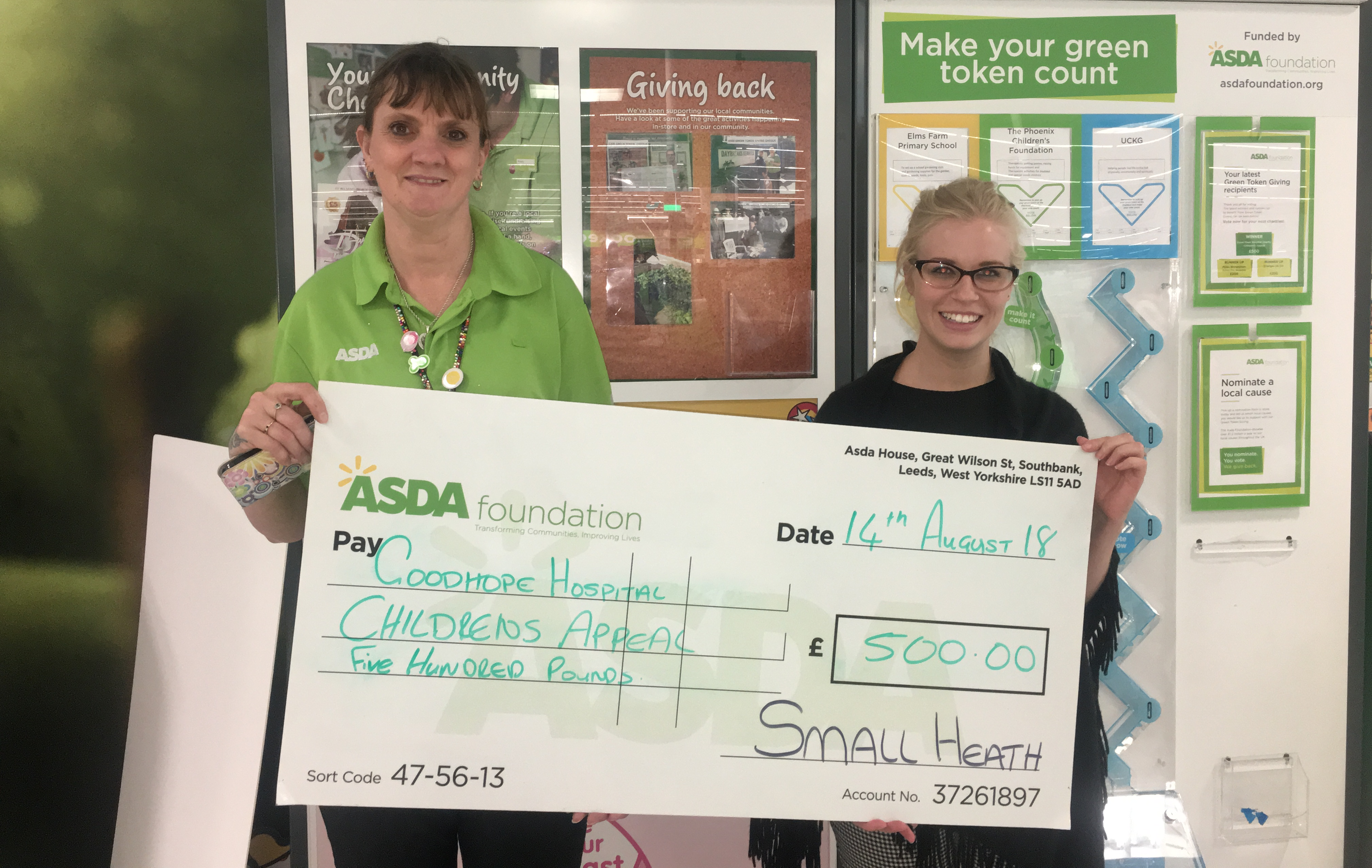 Laura Power, Fundraising Manager at Good Hope Hospital Charity, said: “A huge thank you goes to Asda in Small Heath who chose the Charity as one of their three green token scheme, and their customers who have been voting for us over the last three months. The £500 donated will go towards ‘added extras’ for the children who go in and out of the hospital every single day.”