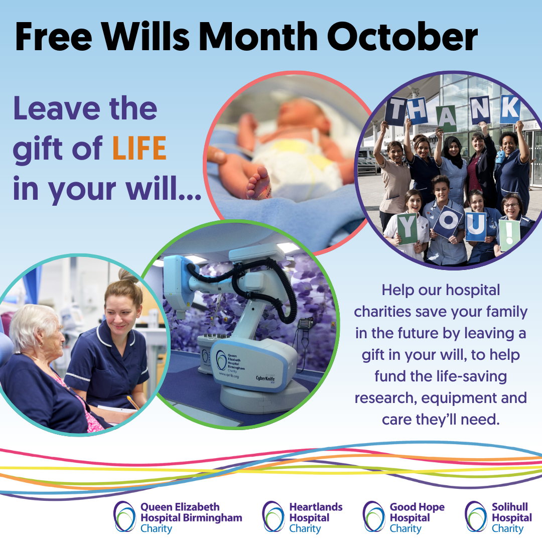 October is Free Wills Month and Queen Elizabeth Hospital Birmingham Charity, Heartlands Hospital Charity, Good Hope Hospital Charity and Solihull Hospital Charity are highlighting the difference gifts in wills can make to your local hospital.