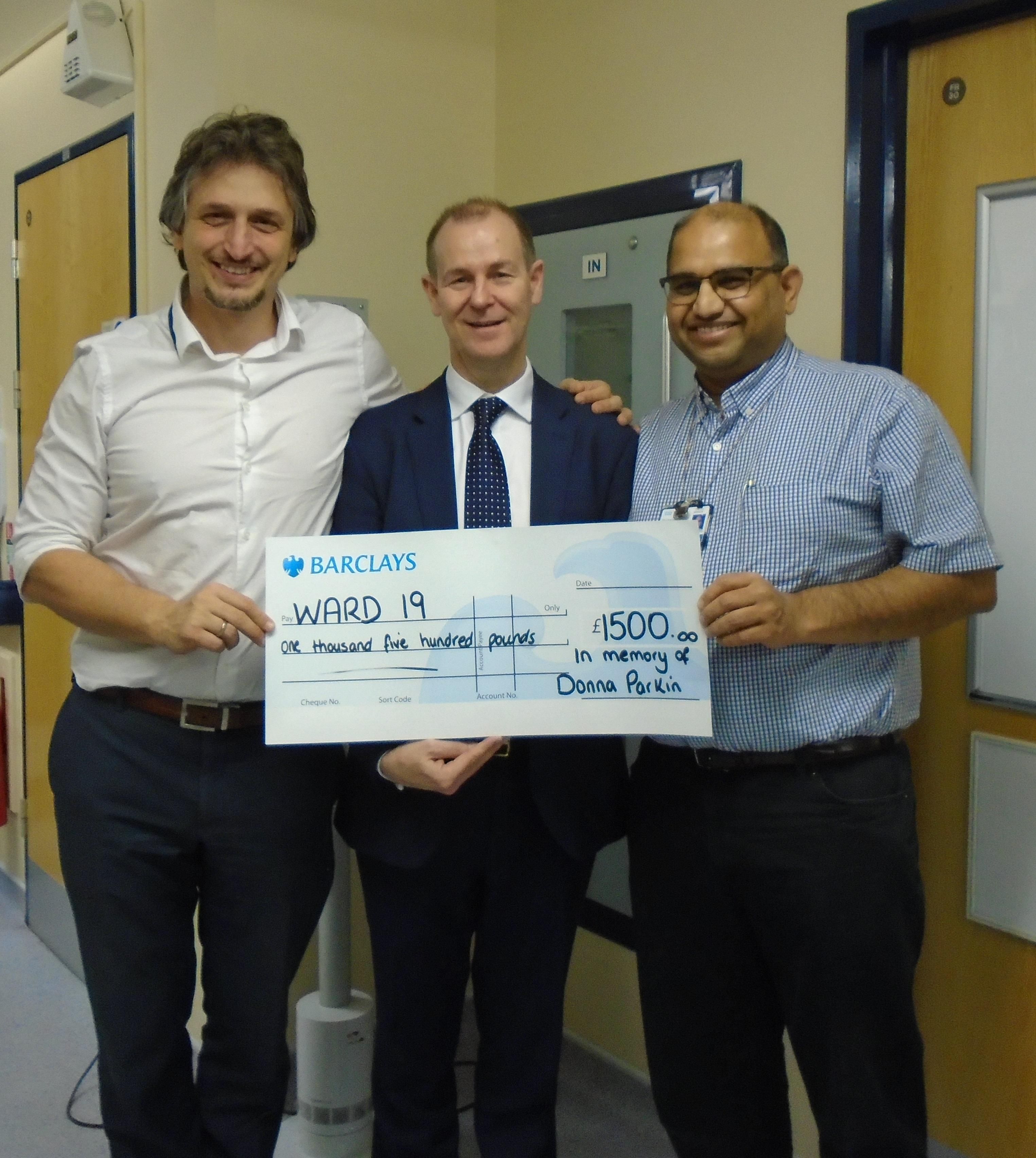 Ken Parkin has visited Ward 19 at Heartlands Hospital to hand over a cheque for £1,500 in memory of his wife Donna who was treated on the ward.