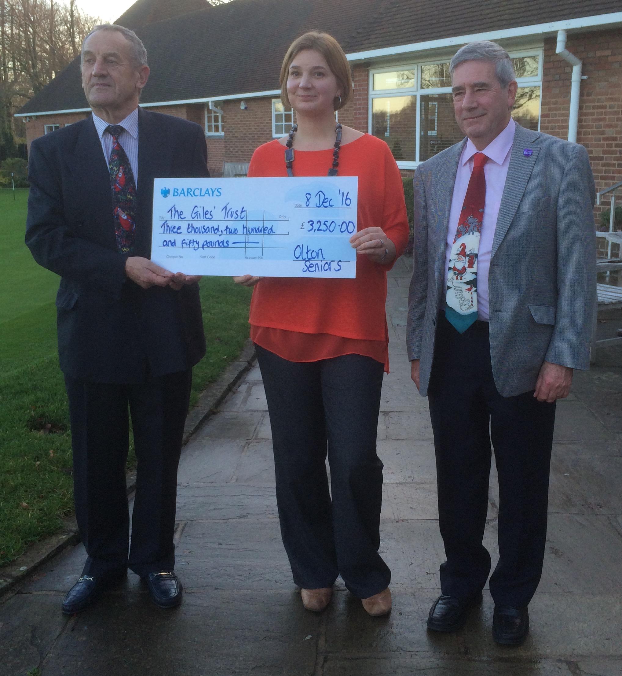 After a year of fundraising Olton Golf Club's Seniors presented a cheque to Cathryn Worth, on Thursday 8th December at their end of year Christmas Dinner event. Vice Captain Terry Hanley had been given the task of appointing a Charity of the Year to work with and following his wife, Judy, receiving care at the Queen Elizabeth Hospital the previous year for a brain tumour, The Giles' Trust, which supports patients with brain tumours at the hospital, seemed the obvious choice.
