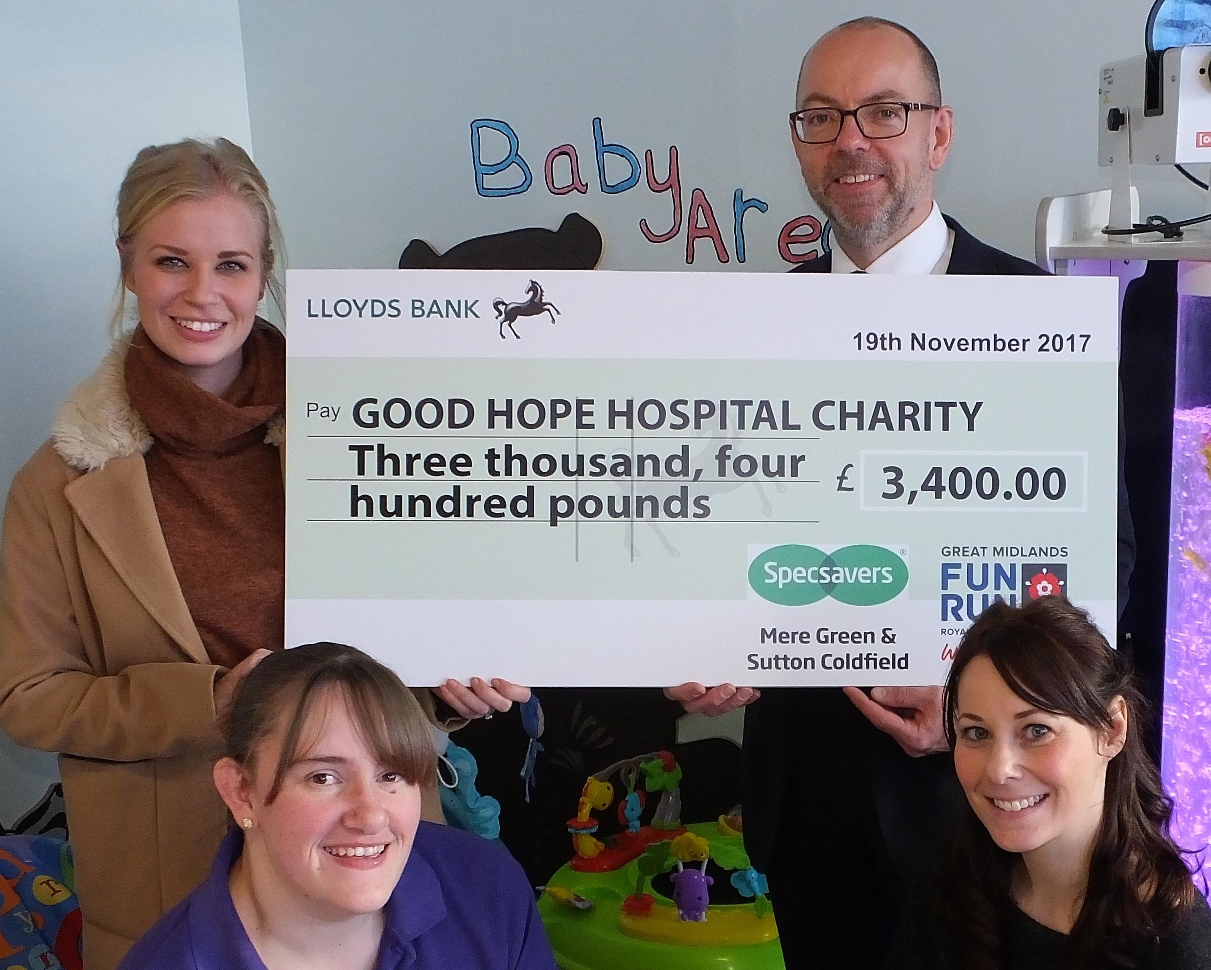 A dedicated team from Specsavers branches in Mere Green and Sutton Coldfield have raised an incredible £3,400 to support children being treated at Good Hope Hospital.
