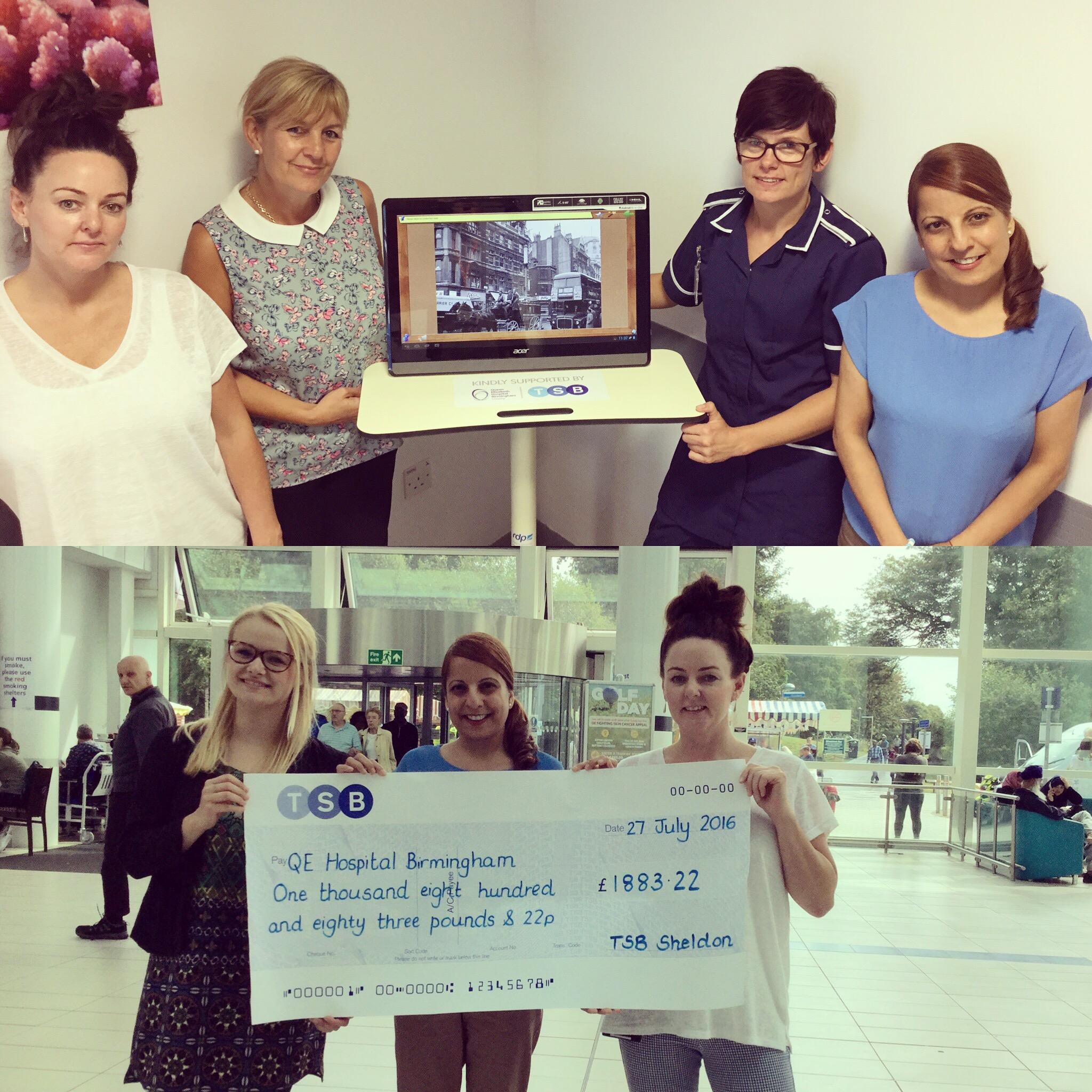 On Wednesday 27 July, representatives from TSB Sheldon visited Queen Elizabeth Hospital Birmingham (QEHB) to deliver a cheque for £1,883.22 to QEHB Charity, bringing their fundraising total up to more than £5,800 for the Charity’s Elderly Care Appeal.