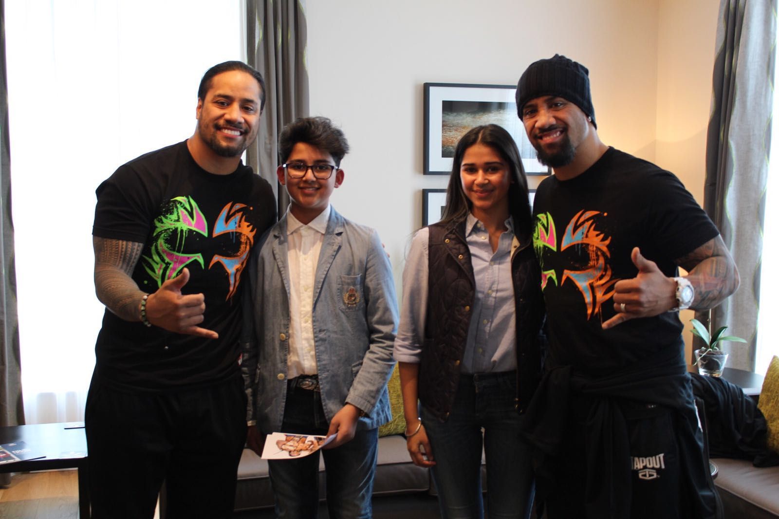 The Soamoan American professional tag team consists of twin brothers known by the stage names of Jimmy Uso and Jey Uso. The champion pair visited Fisher House during their stay in Birmingham, where they took part in WWE Live; Wrestlemania Revenge Tour at the Barclaycard Arena, Birmingham.